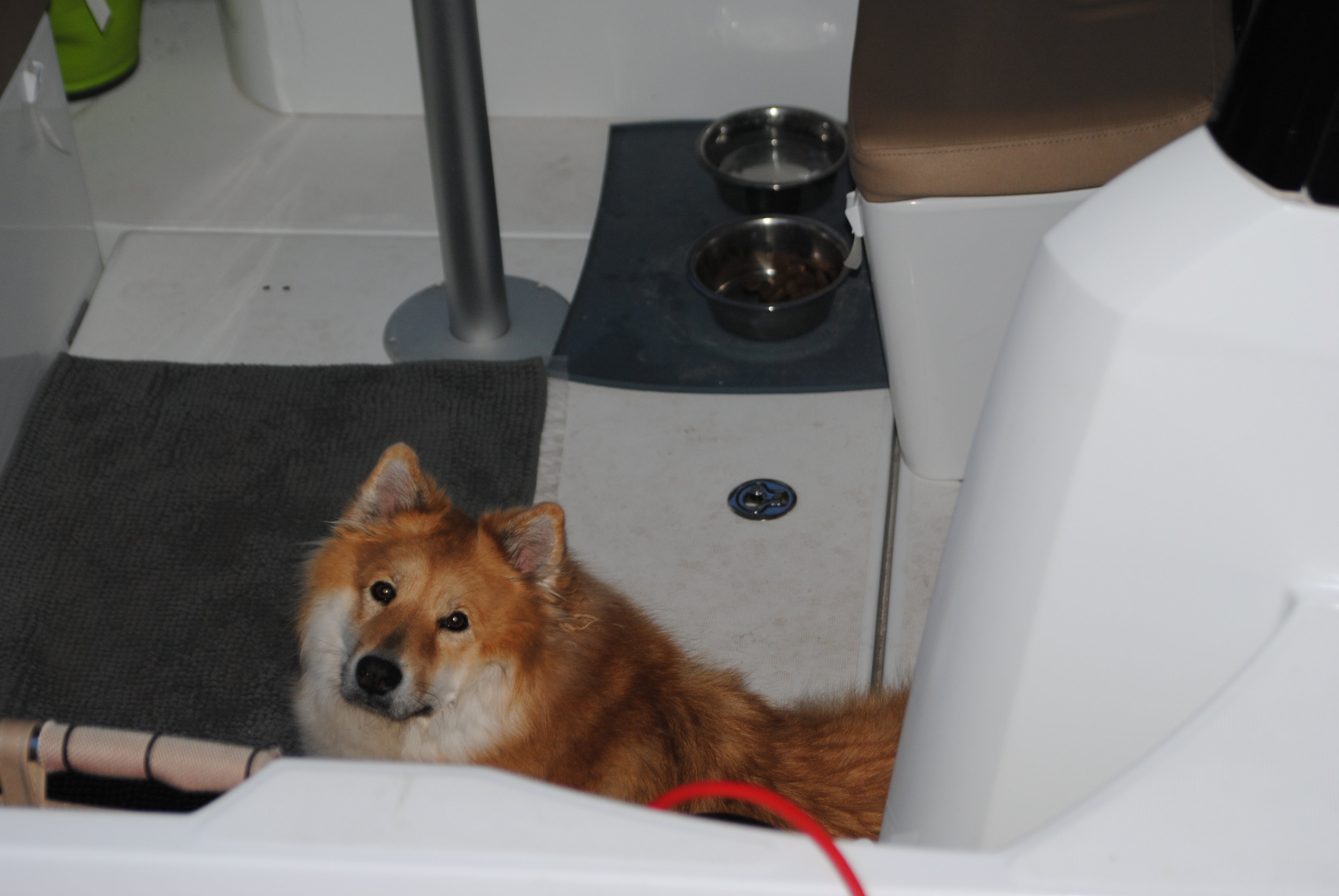 Wir machen eine Gassi-Runde, erkunden ein wenig die Umgebung und erledigen dabei gleich die Formalitäten. Da es nun anfängt zu regnen, gehen wir zurück zum Boot und machen es uns dort gemütlich. Wie man sieht, hat sich Reika eingewöhnt und ist völlig entspannt.