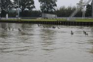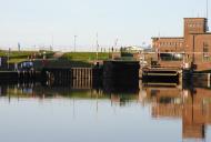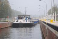Es ist beeindruckend, wie schnell und mit welcher Menge das Wasser aufläuft. Die Schleuse bekommt den Funkruf, das ein leeres Motorschiff zu Berg schleusen möchte. Das wird bestätigt und wir werden von der Schleuse aufgefordert mit dem Berufsschiff zu schleusen. Ach ja, der Festsitzer ist mittlerweile auch wieder frei, so das die Fahrrinne wieder zur Verfügung steht. Das Schleusen geht schnell und problemlos von der Hand und wir haben damit die Tidengewässer hinter uns gelassen.