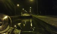 Die letzte Schleuse für heute wäre Bevergern, vorausgesetzt, wir erreichen diese noch vor Betriebsschluss, es ist mittlerweile schon dunkel. Kurz bevor wir an der Schleuse ankommen, höre ich, wie der „Langsamfahrer“ vor uns sich an der Schleuse anmeldet. Da schon ein Schiff auf Warteposition liegt und er zu lang ist, um dort mitzuschleusen, ist für ihn die Fahrt hier vorerst zu Ende. Ich rufe sofort die Schleuse über Funk um mich anzumelden. „…nur noch einmal hoch, dann ist Schluss…“. Ich schildere ihm kurz unseren Plan noch bis Fuestrup zu fahren. Daraufhin lenkt er ein, „…ok, dann mit dem Berufsschiff…aber zügig…“. Ich bedanke mich artig und wir legen uns auf Warteposition. Das Motorschiff vor uns hat uns bemerkt und fragt, ob wir die sind, die mit ihm hochschleusen werden. Wir bestätigen das. „Dann haltet bitte ein wenig Abstand, ich muss die Maschine umstellen…“. Ich kann mit der Information zwar nicht wirklich etwas anfangen, aber da ich so wie so immer einigen Abstand halte, sage ich zu. Als die Ampel grün wird und ich den Pressluftstoß höre, ist mir schlagartig klar, was gemeint war. Das Motorschiff vor uns hat kein Wendegetriebe und muss den Motor anhalten, vor den Kompressionspunkt drehen und dann mit einem Pressluftstoß wieder anwerfen. So wird über die Drehrichtung des Motors die Drehrichtung der Schraube bestimmt. Das dauert natürlich etwas länger als einfach den Hebel nach hinten zu ziehen, aber der Skipper hat es drauf. Nach 5 Minuten ist er in der Kammer fest und wir 30 Sekunden danach auch. Die Tore gehen zu und wir schleusen das zweite mal bei Nacht. Als wir ausfahren, ist noch alles taghell, da sich rechts und links beleuchtete Liegestellen für die Berufschifffahrt befinden. Danach wird es aber dunkel und zwar richtig dunkel. Gut das ich am Bug den Scheinwerfer montiert habe, der leistet nun sehr gute Dienste. In etwa 3 bis 5 Metern Abstand zum steuerbordseitigem Ufer fahren wir über den Kanal. Hin und wieder wabern dichte Dunstschwaden über dem Wasser und behindern die Sicht sehr. An Hand der Brückenbezeichnungen stellen wir unsere Position fest, wir wollen schließlich nicht an der „alten Fahrt Fuestrup“ vorbeifahren. Um kurz vor 1 Uhr sind wir an der Einfahrt angekommen und laufen langsam in die Marina ein. Wir finden einen freien Platz und machen erleichtert fest. Da wir noch nichts gegessen haben, machen wir uns schnell noch etwas warm, essen und gehen dann in die Koje.