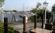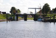 Wir fahren den Kanal nicht bis nach Emden, sondern verlassen ihn vorher nach Süden auf den Verbindungskanal Richtung Ems-Seitenkanal. Auch hier sind noch ein paar Brücken und die Verbindungsschleuse zu nehmen, was aber dank der kooperativen Mitarbeit des Schleusenpersonals kein Problem darstellt. Die Verbindungsschleuse mit der davor liegenden Brücke ist durch eine Vorrichtung zur Selbstbedienung ausgerüstet. Kleiner Tip, wirklich feste an der Kette ziehen. Kurz nachdem die Brücke geöffnet hat, geht auch die Schleuse auf, so das keine Wartezeit entsteht. Die Schleuse selbst hat ein Mittelhaupt, deshalb sollte man so weit wie möglich nach vorne durchlaufen, damit diese wassersparende Maßnahme auch genutzt werden kann. Zum Festmachen sind in der Schleuse Gleitstangen angebracht. Aber Vorsicht, auch wenn es so aussieht, als wenn die Kammer glatte Wände hätte, hat sie diese nicht. Stattdessen stehen in größeren Abständen runde Dalben, deren Lücken für manches Boot recht groß sind. Deshalb gut abfendern und beim Schleusenvorgang die Augen offen halten. Nachdem wir aus der Schleuse heraus sind, haben wir freie Fahrt bis zu unserem Ziel Oldersum. Na ja, zumindest fast freie Fahrt. Es gibt noch eine feste Brücke, deren Höhe mit 3 Metern angegeben ist. Ich lege die UKW-Antenne und wir fahren vorsichtig unter dem Bauwerk durch. Plötzlich ein Aufschrei meines Schwagers, wir haben nicht an den Flaggenstock gedacht und dieser hat genau einen Zentimeter Platz unter der Stahlkonstruktion, Glück gehabt. Die folgende Brücke ist mit 3,10 angegeben und wir passen ohne Probleme darunter durch. In Oldersum angekommen machen wir in einer freien Box des Yacht-Club Unterems fest und gehen auf die Suche nach einer Möglichkeit irgendwo zu essen.