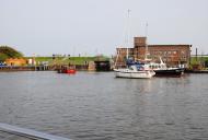 Dadurch sind wir nun gezwungen, das Fahrwasser zu verlassen und uns an dem Festsitzer vorbei zu manövrieren. Von der Uhrzeit her ist nun Niedrigwasser erreicht, was wir auch direkt merken. Ich höre die Schraube durch den Schlick drehen und fahre den Außenbordmotor sofort in den Flachwassermodus hoch. Mit ein wenig „schunkeln“ im Boot rutschen wir an dem Motorschiff vorbei und erreichen vor der Schleuse wieder die Fahrrinne mit ihren 40 cm Wassertiefe.