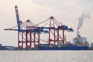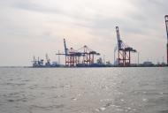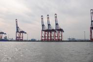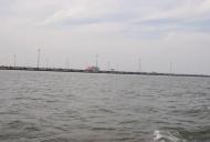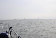Auch hier haben wir keine nennenswerten Wellen und kommen gut voran. Für die Seeschleuse in Wilhelmshaven muss ich uns mindestens eine Stunde vorher anmelden. Ich rechne kurz nach und stelle fest, das wir in etwa 1,5 bis 2 Stunden dort ankommen werden. Also das Handy raus und angerufen. Auf die Information „Wir sind so um 15:30 bis 16:00 Uhr an der Schleuse…“ kommt die Antwort „…wenn ihr 15:30 Uhr hier seid, kann ich euch mit der Sammelschleusung mitnehmen…sonst erst nach 16:30 Uhr…“. Da wir ja völlig ruhiges Wasser haben, können wir die Geschwindigkeit so anpassen, dass wir um 15:30 Uhr an der Schleuse sind. Ich melde uns also für die Sammelschleusung an. Die weitere Fahrt führt uns an der imposanten Industriekulisse, den Löschbrücken und dem Jade-Weser-Port vorbei.