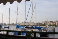 Unsere Berechnung stimmt auf die Minute und wir können mit vielen anderen Booten in die Schleuse einfahren. Es ist schon beeindruckend, wenn man in diese 390 Meter lange und 60 Meter breite „Kammer“ einfährt. Zum Anlegen am „Schwimmsteg“ (eigentlich der Fender für die großen Pötte) müssen wir noch schnell ein paar Korrekturen an den Fendern vornehmen. Dieser Steg ragt tatsächlich nur wenige Zentimeter aus dem Wasser und ist dazu noch von der Wasseroberfläche aus Richtung Schleusenwand schräg gestuft. Die Fender müssen wir also so tief hängen, dass sie auf dem Wasser aufsetzten und sich leicht schräg unter den Rumpf schieben. Für die Sportboote gibt es Kreuzpoller, die aber teilweise von dem oberen Teil des Schwimmsteges abgedeckt werden. Vom Boot aus sind diese nicht gut zu erreichen, mein Schwager steigt also aus und macht die Leinen fest. Nachdem alle sicher fest sind, schließt sich das Tor. Schon ein imposanter Anblick, wenn so ein 1700 Tonnen schweres und 60 Meter breites Tor langsam zufährt. Das anschließende Ablaufen des Wassers ist kaum zu merken. Eigentlich logisch, eine so gewaltige Wassermenge kann man ja auch nicht ungebremst in den Hafen laufen lassen. Nach dem Ende des Schleusenvorganges fahren wir dann aus der Kammer in den Hafen, weiter unter der Kaiser-Wilhelm-Brücke durch zum Hochseeyachtclub Germania. Der Hafenmeister nimmt uns schon am Anleger in Empfang und weist uns gleich in die Örtlichkeiten ein. Als der Skipper des Seglers vor uns mitbekommt, dass ich für den nächsten Tag 8 Uhr den Schleusenwärter zur Marienschleuse bestellt habe, schließt er sich uns an. Sein Ziel ist die Werft hinter der Schleuse. Ich telefoniere noch eben mit der Deichbrücke um diese für morgen 7:30 Uhr zu bestellen, dann halten wir noch einen kleinen Plausch mit dem Hafenmeister und machen uns auf den Weg in das Clubrestaurant.