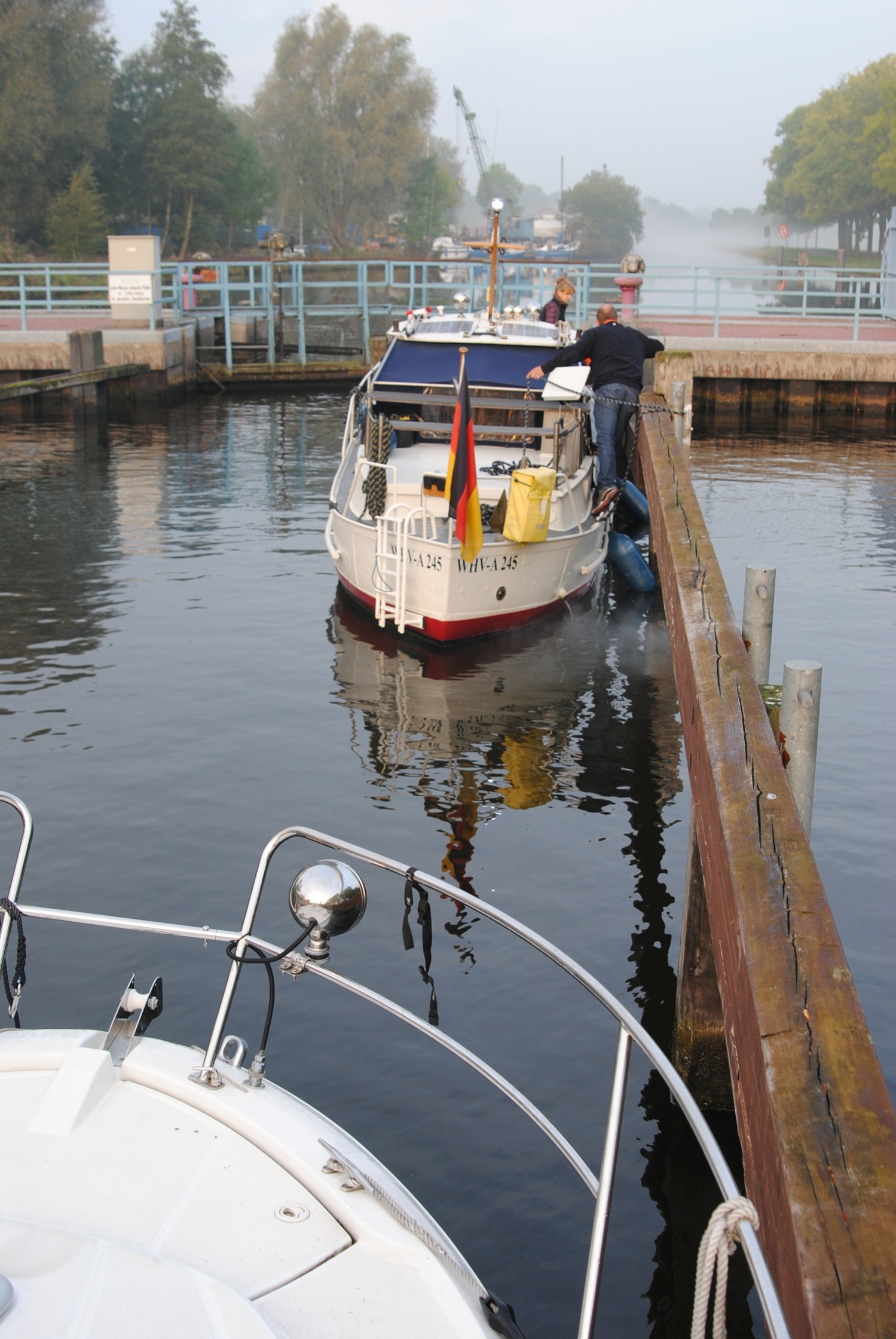 Die nächste Schleuse, Rahe. Besonderheit hier, sie hat ein Mittelhaupt um Wasser zu sparen. Man sollte also bis ganz nach vorne durchlaufen, damit dies auch genutzt werden kann.