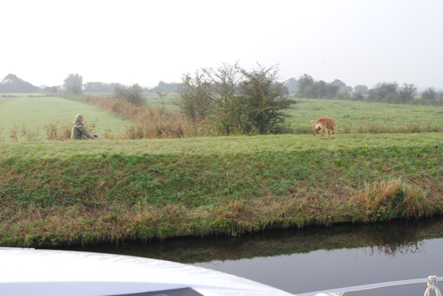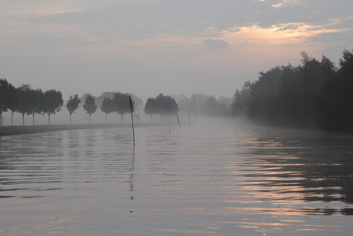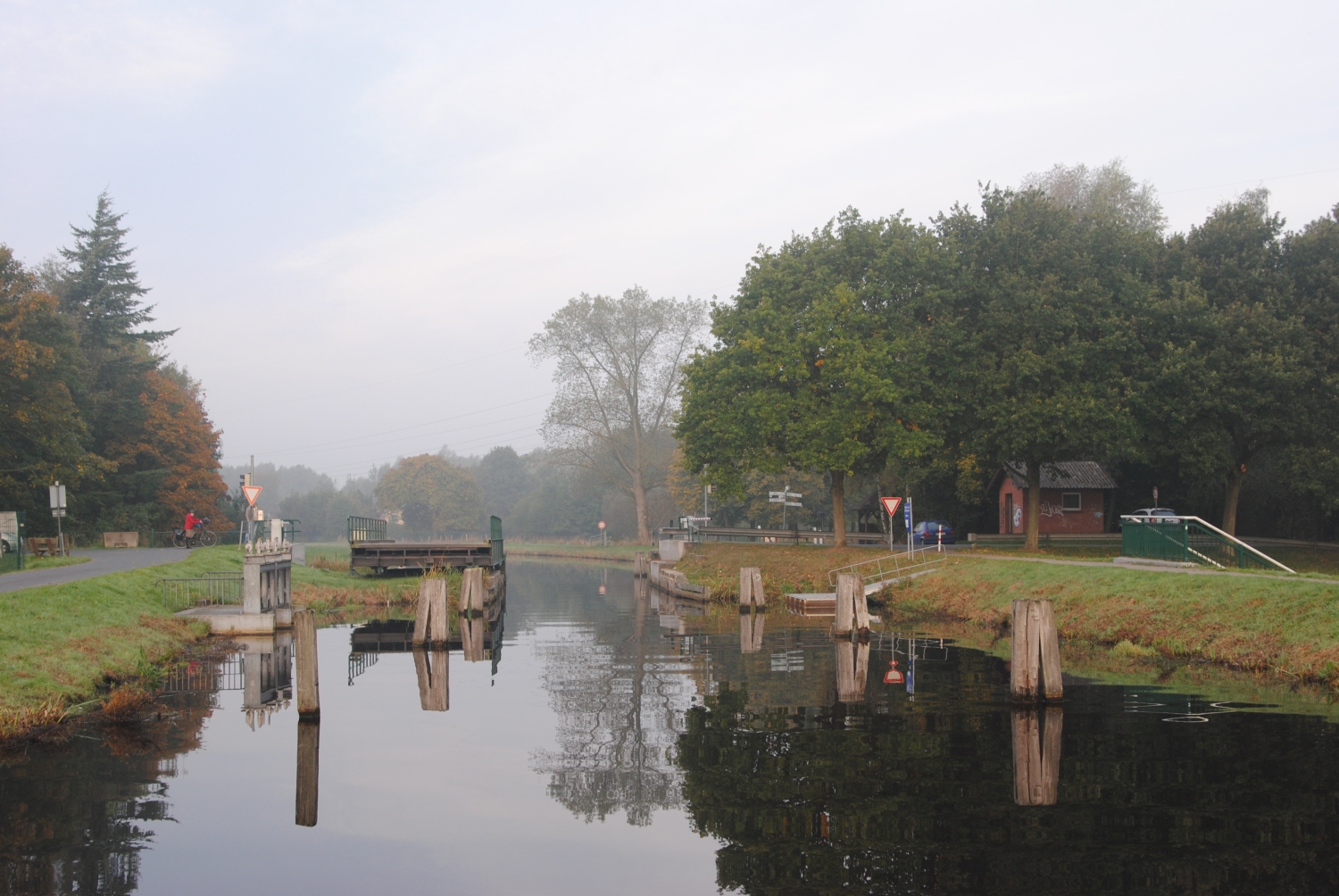 Kurz vor der nächsten Brücke noch ein Blick zurück. Es ist halt noch früh und kühl, deshalb wabert der Dunst über dem Wasser.