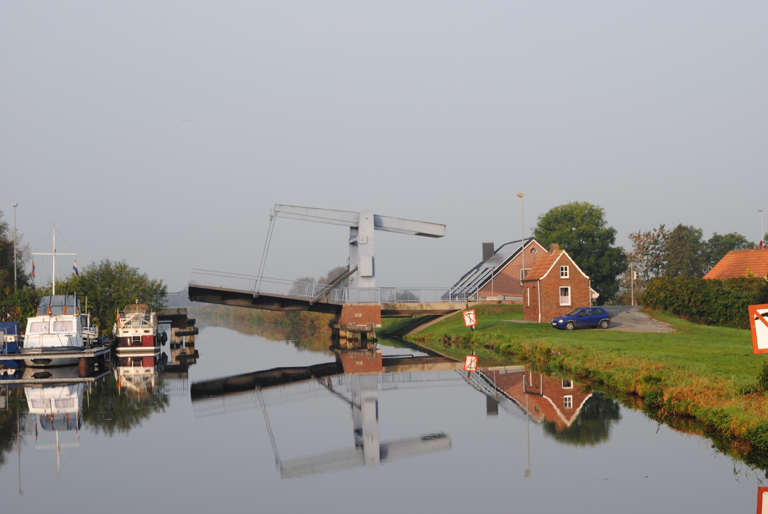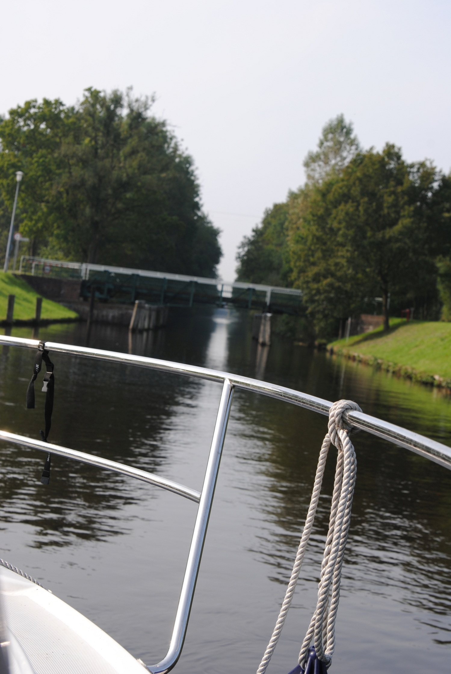 Nach dieser Schleuse kommt keine bewegliche Brücke mehr. Aber es gibt noch zwei feste Brücken, die eine Durchfahrthöhe von 3,0 m (die auf Höhe des Yachtclub Wiking) bzw. 3,10 m (die auf Höhe des WSV Friesland) haben. Die Angaben stimmen aber nur, wenn der Wasserspiegel im Kanal normal hoch ist. Also hier sehr vorsichtig fahren, wenn die eigene Höhe knapp darunter liegt. Die erste Brücke hätte mich fast den Flaggenstock gekostet.