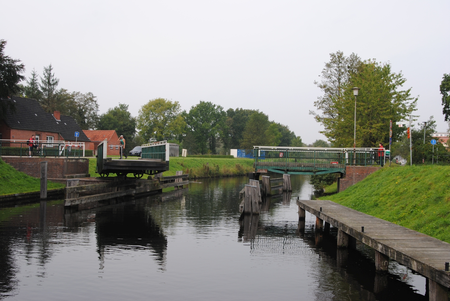 Nun sind wir in Aurich. Die Brücken heraus sind schon etwas größer und der Schleusenwäter sehr schnell.