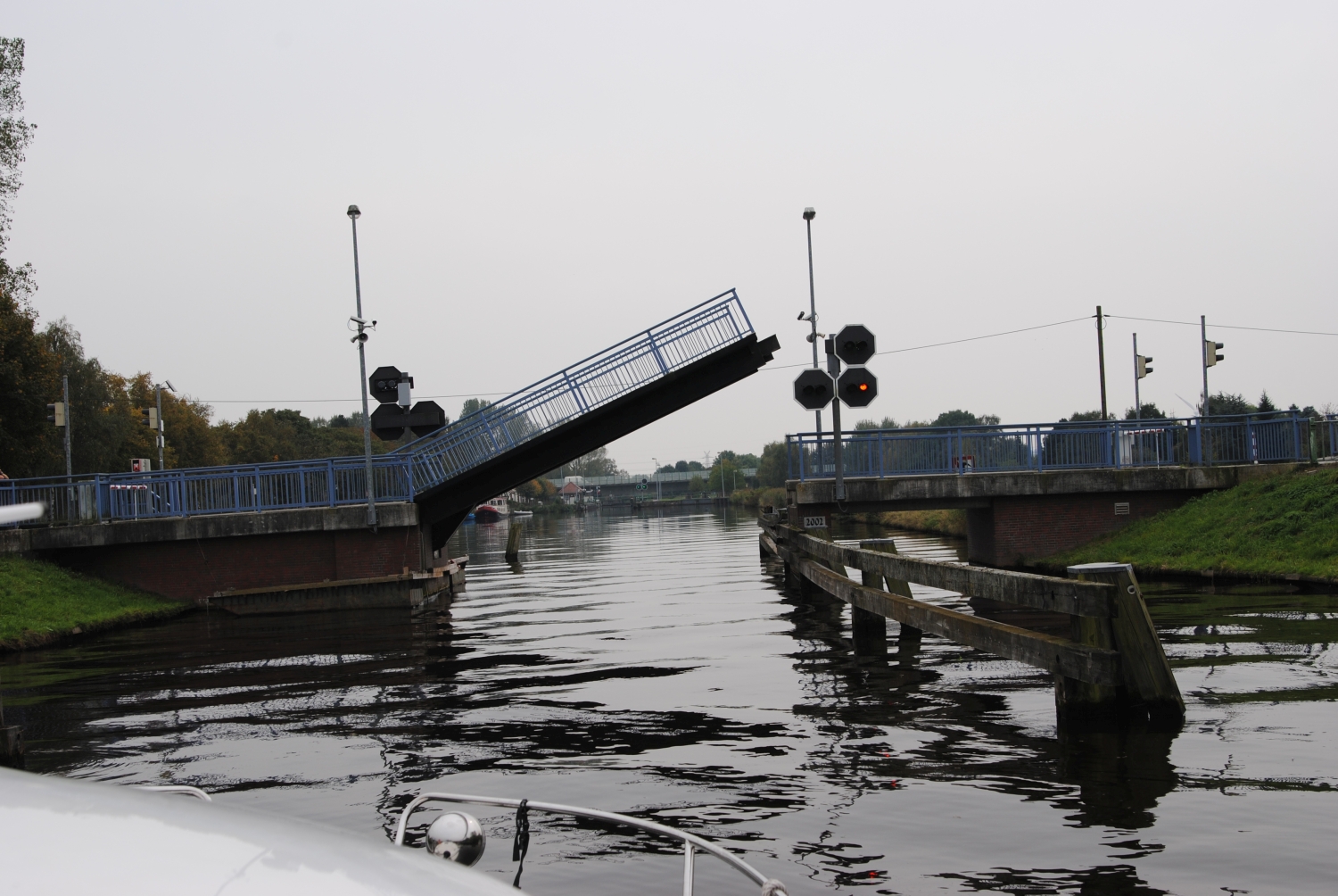 Hier ist Vorsicht geboten, denn unmittelbar hinter der Biegung steht man vor den "Gleisen". Da der Brückenwärter erst die Straßenbrücke wieder schließt und dann die Eisenbahnbrücken öffnet, steht man eine kurze Zeit in einem kleinen "Plantschbecken". Wenn mehrere Boote zusammen unterwegs sind, wird das ganz schön eng.