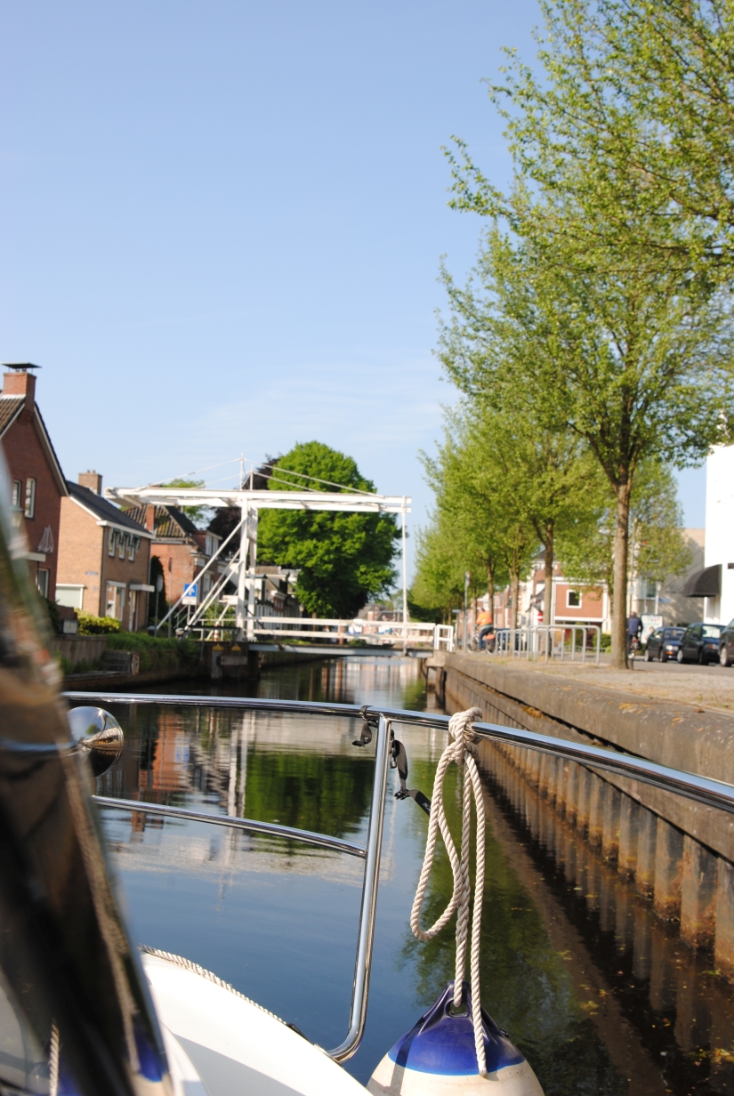 Ich erkunde den kleinen Ort und schaue mir die bewegliche Brücke, unter der ich ja auch durchgefahren war, aus der Nähe an. Es ist erstaunlich, wie oft diese Brücke gehoben wird. Der weitere Rundgang durch den Ort enthüllt die Ursache dafür. Es gibt eine riesige Charterbasis, zwei Bootstankstellen und drei Yachthäfen. Hier scheint ein Zentrum des niederländischen Wassersports zu sein. An der Brücke liegt ein hübsches Lokal mit einer Terrasse direkt am Wasser. Hier kehre ich ein und esse ausgesprochen gut. Der Ort ist recht klein, aber sehr hübsch.