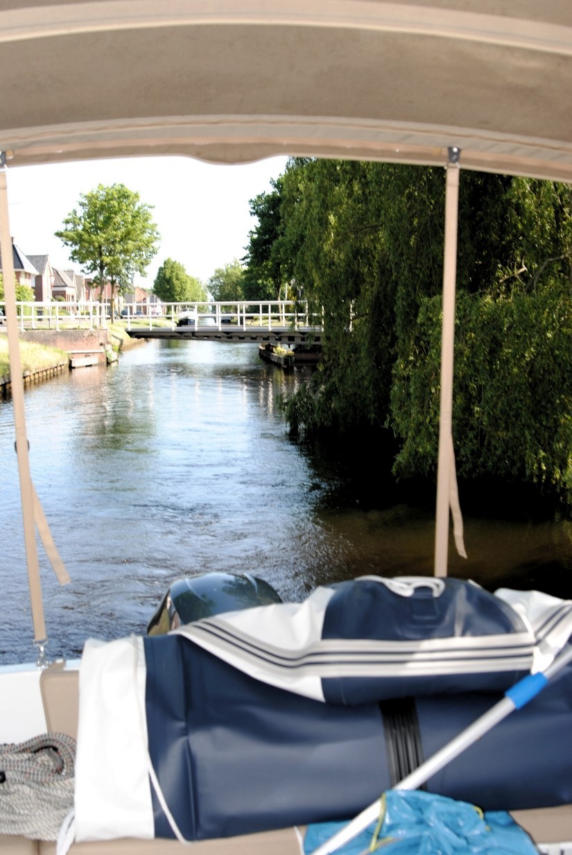 Pünktlich um 9 Uhr kommen die Brückenwächter, einer mit dem Fahrrad, der andere mit dem Skooter. Ok, jetzt zählt es, Leinen los, rückwärts aus der Box in den böigen Wind. Meine Vorbereitungen zahlen sich aus, die Windanfälligkeit hat deutlich abgenommen und ich komme gut um die nächste 90 Grad Biegung. Die erste Brücke ist noch nicht offen und ich muss aufstoppen, auch hier weniger Probleme als gedacht, Stuppi lässt sich recht gut in der Kanalmitte halten.