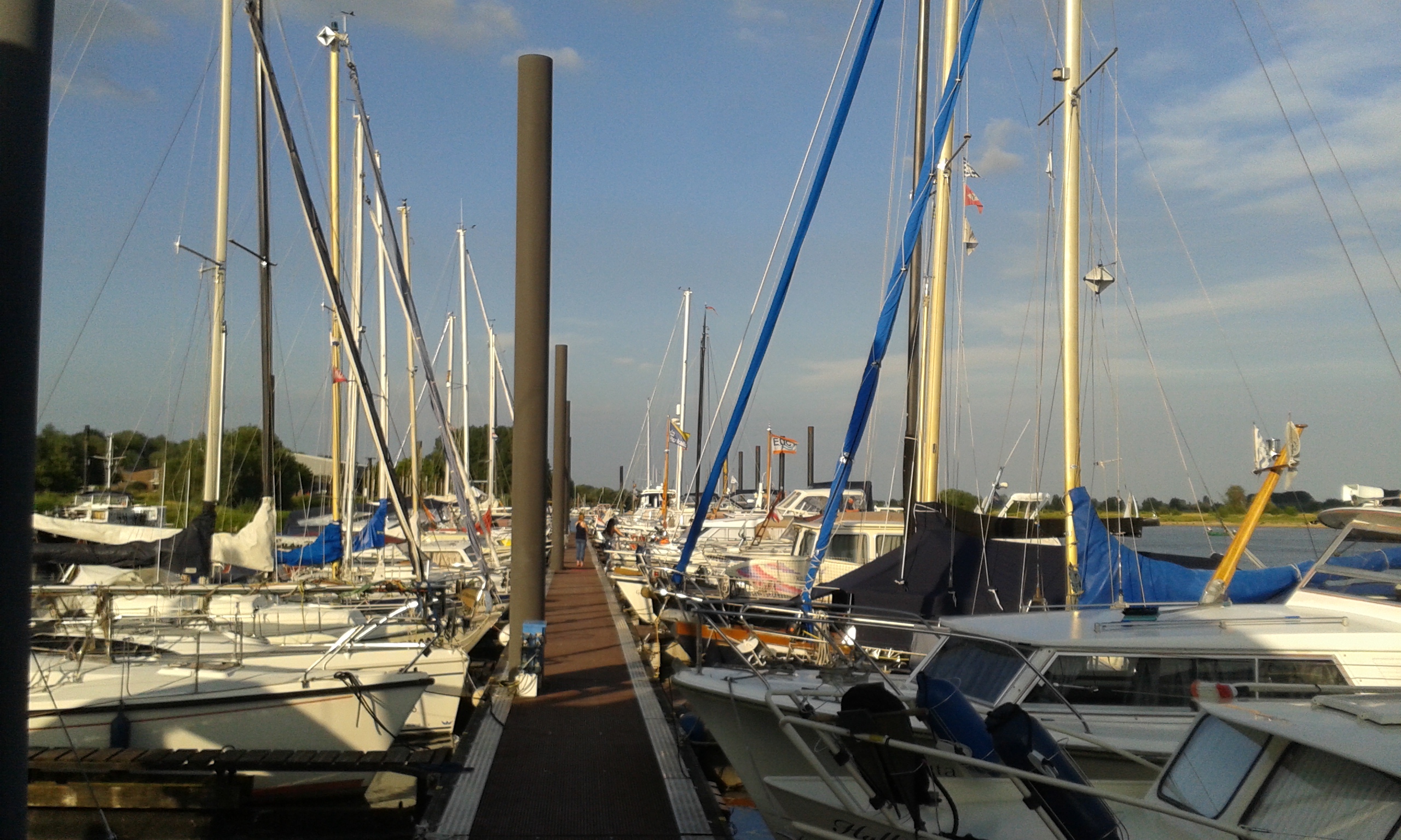 Während ich den Steiger ansteuere, kommt der Hafenmeister an den Steg und ist mir beim Anlegen behilflich. „Ich habe gesehen, Du bist alleine, dann helfe ich Dir besser“. Nach einer kurzen Begrüßung gehe ich mit ihm in sein Büro um die Formalitäten zu erledigen. Er zeigt mir auf einem Lageplan des Hafens meinen Platz für die Nacht. Ich lege also ab und fahre das kurze Stück zu dem zugewiesenen Anleger. Der Hafenmeister lässt es sich nicht nehmen, mir auch hier wieder behilflich zu sein. Ich bedanke mich dafür, mache Stuppi für die Nacht fest und schließe den Strom an. Dann gehe ich erst einmal ausgiebig duschen, was für eine Wohltat. Nachdem ich geduscht und frische „Klamotten“ angezogen habe, genehmige ich mir in der kleinen Kneipe ein, zwei Bierchen. Ich mache von dem Angebot des Hafens Gebrauch, mir ein Fahrrad auszuleihen und radel in die Stadt. Außer meinem Müsli heute morgen habe ich noch nichts gegessen. Wijk bij Duurstede ist ein wirklich netter und gemütlicher Ort, ich finde schnell ein hübsches Restaurant (La Siciliana) und nehme draußen Platz. Es ist immer noch recht warm, aber auf Grund des stetig leichten Windes sehr gut auszuhalten. Während des Essens komme ich mit den Herrschaften an den Nachbartischen ins Gespräch. Zu meiner Linken ein junges Paar aus Saarbrücken, das mit dem Fahrrad von Bonn bis hierher gefahren ist. Sie wollen weiter nach Rotterdam und dann an der Küste gen Norden. An meiner rechten Seite sitzt ein Paar, er Niederländer, sie aus Köln. Wir unterhalten uns lange und angeregt über alle möglichen Themen. Leider ist der Abend dann irgendwann doch zu Ende und ich mache mich auf den Weg zurück zum Boot. Erschöpft gehe ich in die Koje, morgen will ich früh los.