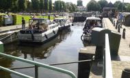Langsam schlägt die Müdigkeit durch und ich mache mich auf den Weg zurück zum Boot. Dort angekommen höre ich von Ferne laute Musik, mein erster Gedanke, ein Stadtfest oder ähnliches. Die Musik kommt aber immer näher und wenige Augenblicke später fährt ein großes Partyboot durch die Schutzschleuse in den Hafen. Die Stimmung auf dem Kahn ist wirklich gut und die Live-Band gibt alles. Das Schiff dreht im Hafen einige Pirouetten und setzt seine Fahrt dann durch die Sluis Blokzijl fort.