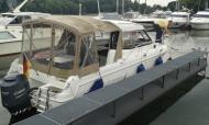 So etwa 300 bis 400 Meter nach der Schleuse, meine Frau ist am Ruder, denke ich, wo fährt sie hin, direkt auf die Spundwand los. "backbord, mehr backbord" rufe ich, "geht nicht, reagiert nicht" ist die Antwort. Ich springe hinzu, knalle den Rückwärtsgang rein und kann verhindern, das wir unliebsame Bekanntschaft mit der Wand machen. Aber meine Frau hat Recht, die Lenkung ist tot, das Ruder lässt sich endlos in die gleiche Richtung drehen, ohne das der Motor sich auch nur ansatzweise bewegt. Im Moment ist kein anderes Schiff in der Nähe, so halte ich mit Vorwärts-/Rückwärtsfahren Stuppi etwa in der Kanalmitte. Per Funk rufe ich auf dem Blockkanal den Verkehrsposten, erkläre ihm die Situation und bitte ihn um Hilfe. Die schicken mir ein Arbeitsboot, das an der anderen Kammer zu tun hat um mich abzuschleppen. Wenige Minuten später trifft das Boot ein und nimmt mich an den Haken. Wir vereinbaren Kanal 15 zwecks interner Kommunikation. Da mein Motor ja einwandfrei funktioniert, kann ich leicht verhindern, das ich auflaufe, indem meine Maschine kleine Fahrt rückwärts läuft. Geplant ist, mich an den Wartesteg für die Berufsschifffahrt zu bringen. Dieser Plan wird verworfen und wir schleusen im Päckchen mit zwei anderen Fahrzeugen zurück auf den Neder Rhein. Hier kann ich hinter die Profiwartestege, dort ist es ruhiger, sicherer und es gibt einen Landgang, über den der Mechaniker zu mir gelangen kann. Die Schleuse hat mir eine Telefonnummer gegeben, die ich während der Wartezeit angerufen habe. Ich habe dem Mechaniker der Scheepswerf Pisano den Fall geschildert und er verspricht zu kommen um zu sehen, was zu machen ist. Als wir hinter das Bollwerk fahren, sehe ich den Mechaniker auch schon. Mein Schlepper verabschiedet sich, nachdem ich ihn für seien Dienste bezahlt habe. Der Mechaniker füllt zuerst einmal Öl auf und schaut dann am Motor, während ich das Ruder bewege. Schnell wird klar, der Hydraulikschlauch hat ein Leck, das Öl spritzt nur so heraus. Klar ist auch, das lässt sich nicht hier vor Ort reparieren. Ich überlege noch, wie wir denn in die kleine Werft des Mechanikers kommen sollen, die liegt so ca. 3 km den Neder Rhein bergan. „Ganz einfach, ich koppel den Hydraulikantrieb vom Motor ab, setze mich daneben, du gibst Gas und ich bewege den Motor von Hand“. Das ist abenteuerlich, besonders bei dem hier herrschenden Verkehrsaufkommen, aber es funktioniert. Gegen 20:30 Uhr legen wir am Werkstattanleger an und bekommen einen Schlüssel, damit wir das Gelände jederzeit verlassen und betreten können. Leider hat er für morgen schon einen Auswärtstermin, so vereinbaren wir für den übernächsten Tag die Reparatur. Gut, dann erst einmal überlegt, wie es mit der Urlaubsfahrt weitergeht. Die Entscheidung wird vereinfacht, da meine Frau einen Anruf von ihrer Firma bekommt und möglichst schnell zurück kommen soll. Wir gehen in dem nahe gelegenen Lokal noch nett essen und danach in die Kojen.