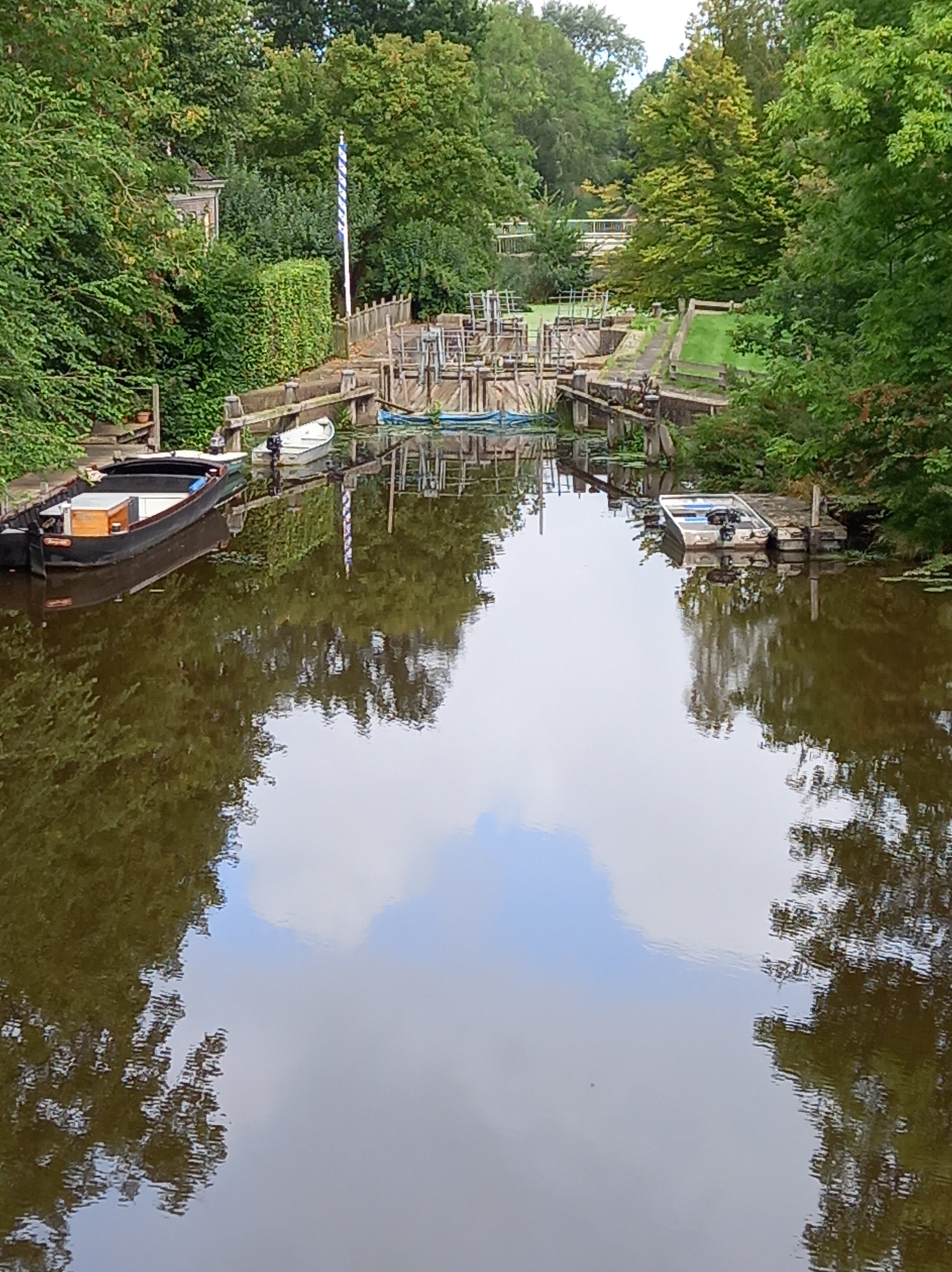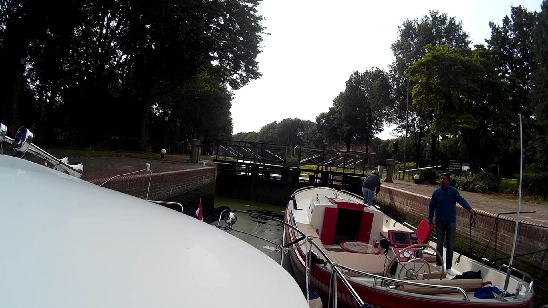 Nach der Durchfahrt geht es über backbord auf die Drentsche Hoofdvaart. Die Strecke bin ich schon öfter gefahren und aus Erfahrung weiß ich, dass es nicht in einem Rutsch bis Zwartsluis zu schaffen ist. So plane ich eine Übernachtung in Dieverbrug ein. Der Hafen liegt etwas außerhalb der Ortschaft, ist aber mit allem ausgestattet. Die Sanitäranlagen sind groß und sauber, es gibt die Möglichkeit zu tanken und auch einige Restaurants sind vorhanden. Außerdem kann man auf der Schleuse eine kleine Ausstellung besichtigen, die sehr informativ ist. Bezahlt wird der Liegeplatz und ggf. Strom und Wasser völlig unkompliziert mit der AanUit.net-App. Wir sind mit drei Booten unterwegs, deshalb wird es in den Schleusen doch recht eng. Da wir abwärts schleusen und der Wasserstand in den Kammern fast die Mauerkante erreicht, kann ich nach dem Aufstoppen problemlos aussteigen und Stuppi von Hand möglichst nahe an die anderen Boote bugsieren.