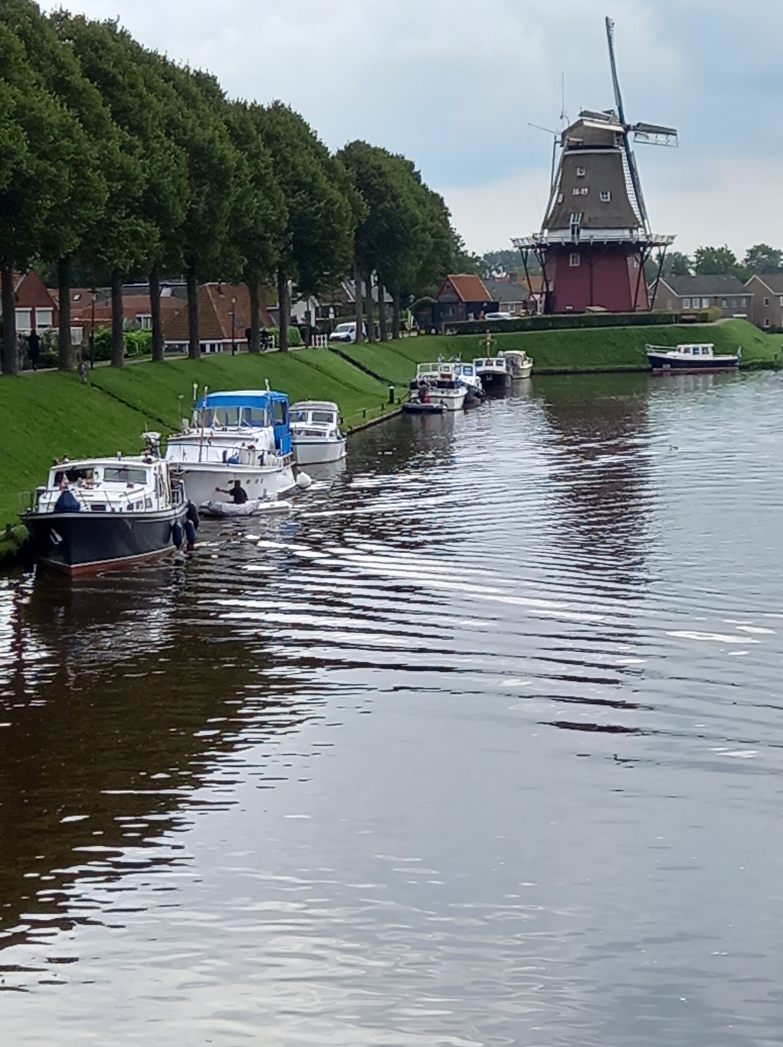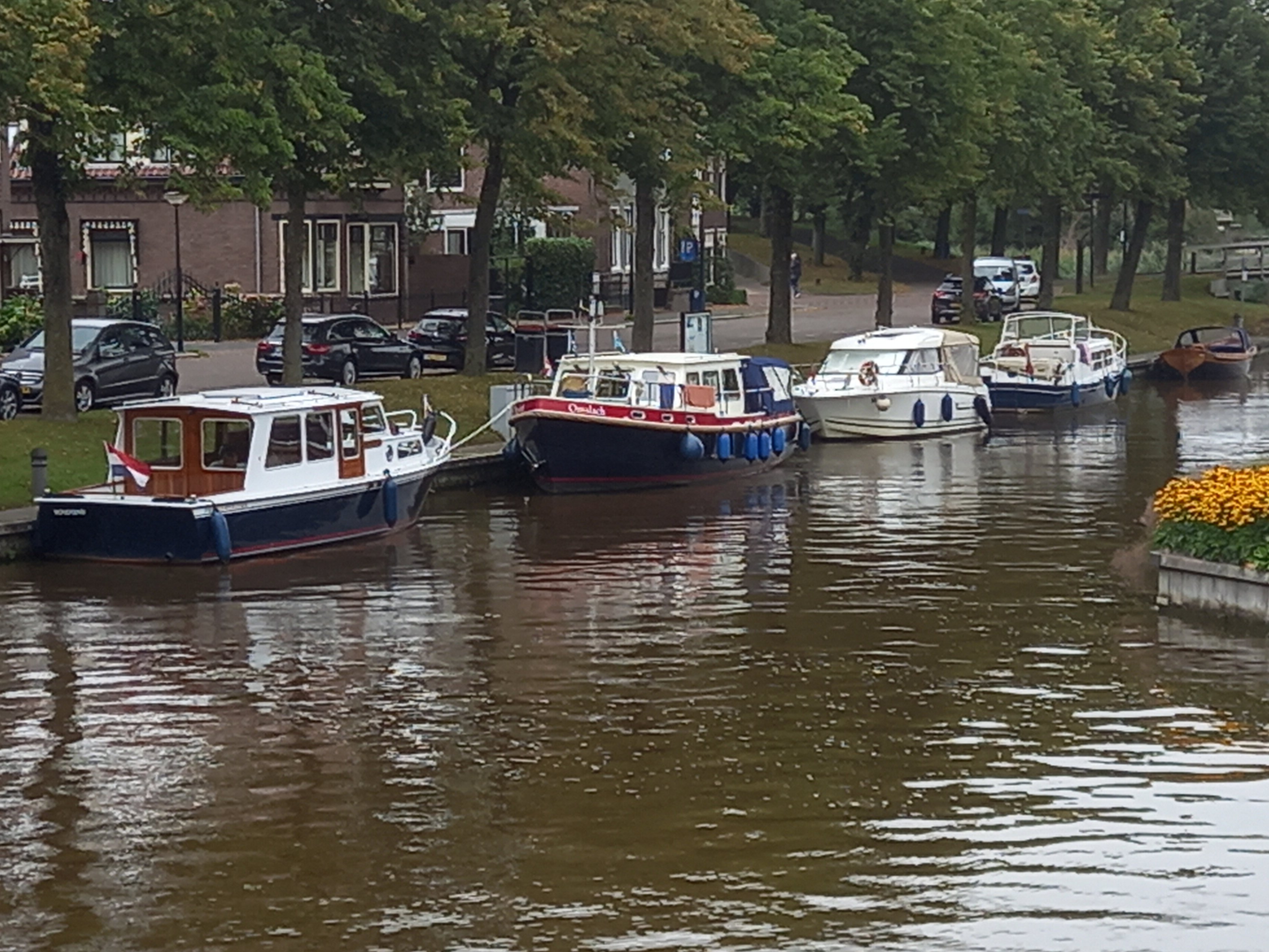 Um 6 Uhr klingelt mein Wecker. Ich gehe sofort duschen und trinke anschließend meinen Kaffee. Das Müsli lasse ich heute weg, ich bin nach dem üppigen Essen von gestern nach satt. So bin ich schon um 7 Uhr unterwegs. Es wird eine spannende Fahrt. Geplant ist es, die Kleiroute bis nach Berlikum zu fahren, von dort über das Moddergat, Blikfaart, Sudhoekster Faart, Ouwe Rij, Leister Feart und Feinsumer Feart zum Dokkumer Ee bei Bartlehiem. Eine selten genutzte Route, die aber interessant scheint. Gestern Abend hatte ich mich mit dem netten Ehepaar von dem Boot, das vor mir lag, darüber unterhalten. Sie sind die Tour letztes Jahr gefahren und fanden die nicht so toll. "...da ist sehr viel Kraut im Wasser, ständig der Kühlwassereinlass dicht...". Ok, nun habe ich einen Außenbordmotor, den ich bei Bedarf in den Flachwassermodus stellen kann. Dabei verfängt sich so gut wie kein Kraut am Schaft. Bis Berlikum gibt es keine Probleme, es ist ja schließlich eine gängige Route. Hier gehe ich backbord in das Moddergat. Es ist recht breit und erst einmal schnurgerade. Aber nach einigen hundert Metern merke ich, wie das Boot des öfteren im "Kraut" stecken zu bleiben droht. Ich befürchte, dass das in den kommenden schmaleren Etappen deutlich mehr werden wird. Also mache ich kehrt, fahre zurück nach Berlikum und von dort die "normale" Kleiroute weiter bis zum van Harinxmakanaal bei Deinum. Von hier geht es dann Richtung Leeuwarden. Ich fahre über die Harlingervaart, durch die Stadt und über das Dokkumer Ee bis nach Dokkum. Letztes Jahr habe ich in der Zuidergracht kurz vor der Woudpoortsbrug gelegen, dieses mal fahre ich in das Kleindiep mitten in der Stadt und mache dort fest.