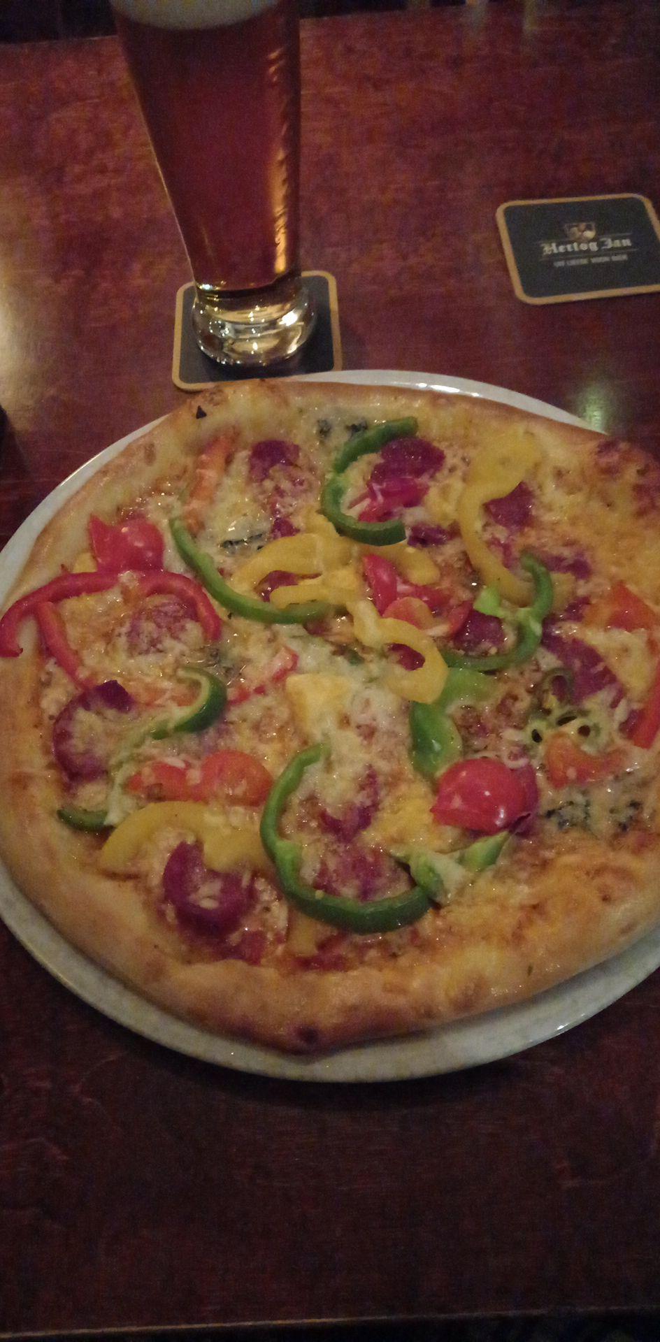 Am Abend gehe ich essen und trinke dazu ein leckeres Bier.