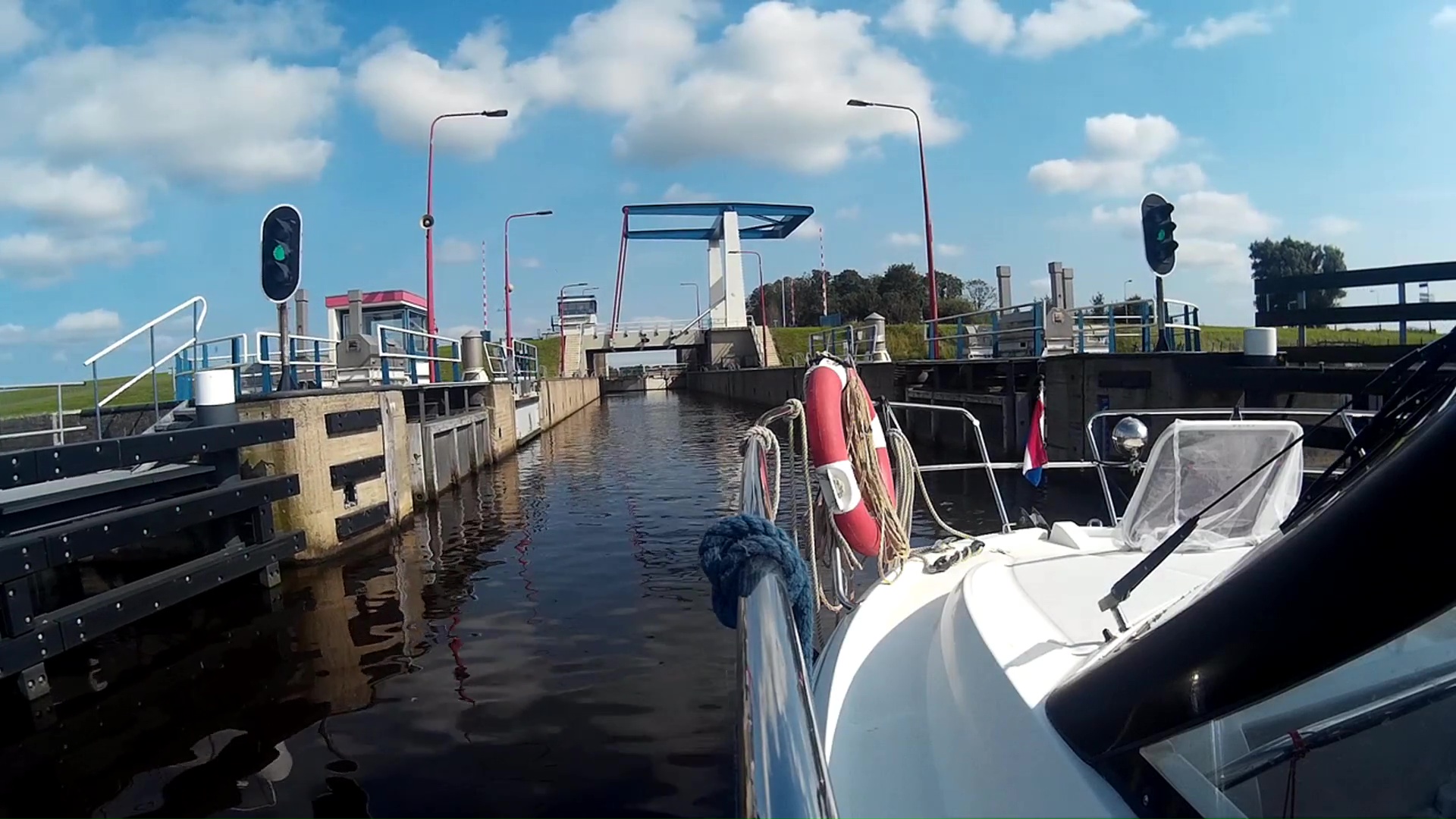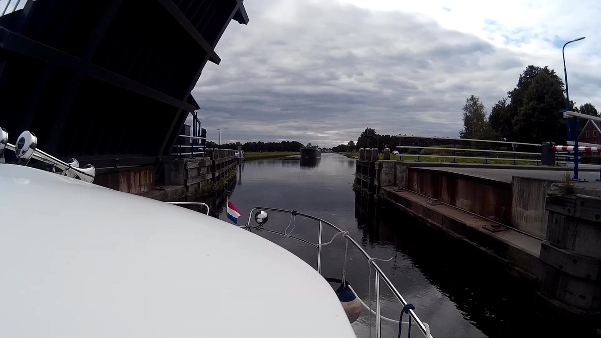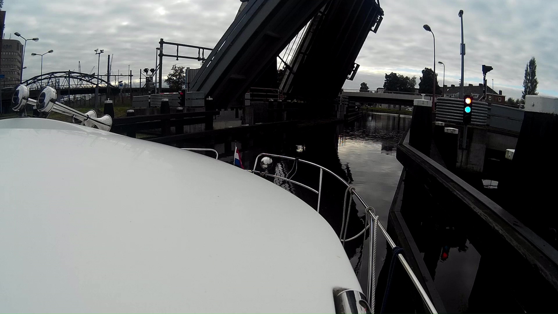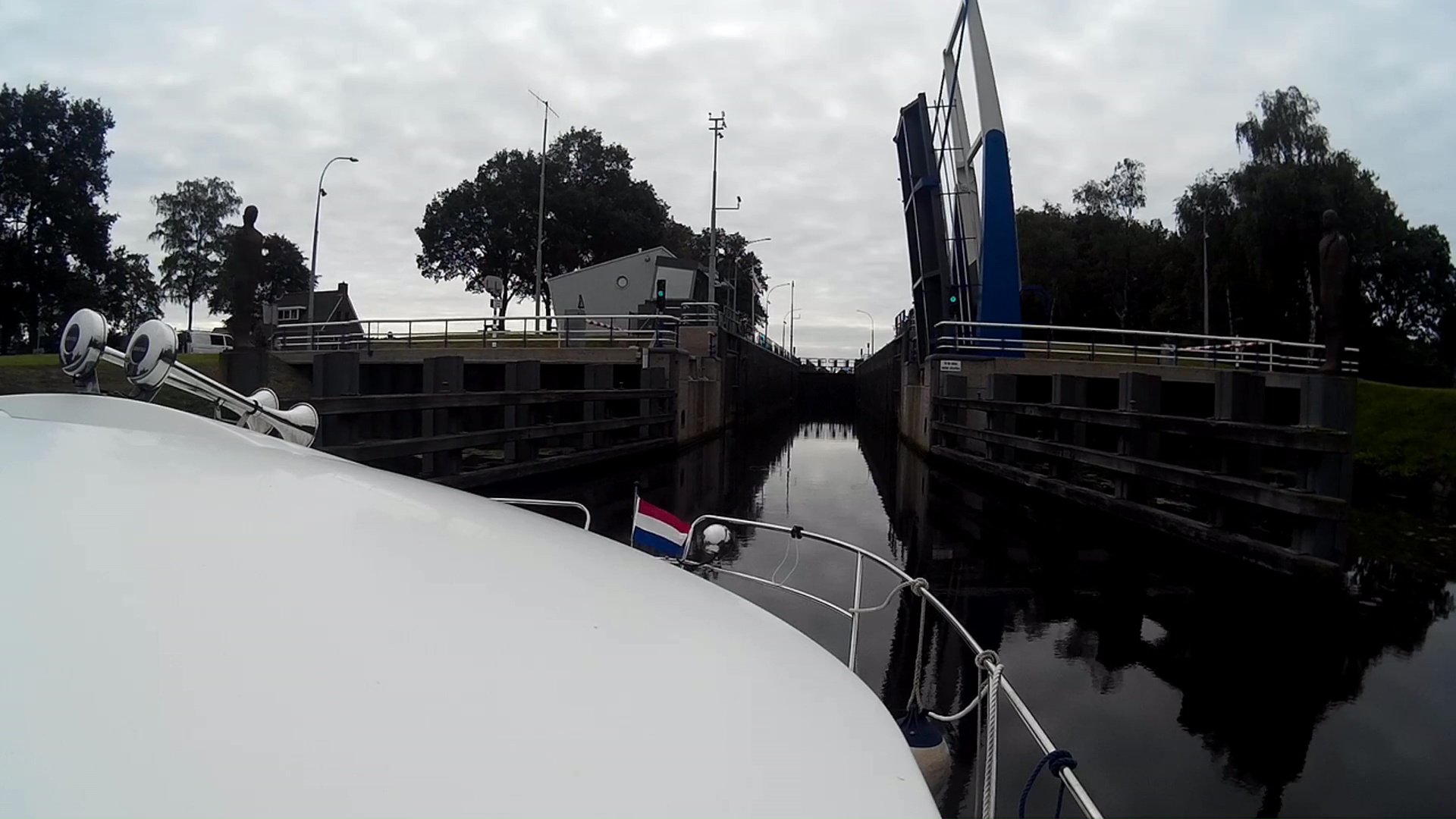 Einige Minuten später wird diese Brücke, die Eisenbahnbrücke und die Zaanbrug geöffnet und ich kann weiterfahren. Die folgenden Brücken, Parkbrug, Muntinghbrug, Julianabrug, van Iddekingebrug und van Ketwich Verschuurbrug, werden auf Abstand bedient. Sobald ich darauf zu fahre, schaltet das Licht auf Rot-Grün und die Brücke ist oben, wenn ich sie erreiche. Hier habe ich keine Wartezeiten, sehr schön. Als ich die van Ketwich Verschuurbrug passiere, habe ich das Stadtgebiet von Groningen hinter mir. Ab hier haben die Brücken und Schleusen wieder die üblichen Öffnungszeiten, also von 9 bis 12 Uhr und von 13 bis 17 Uhr. An der nächsten Brücke, Meerwegbrug, muss ich mich wieder mit dem Meldeknopf ankündigen. Ab hier werden die Brücken videoüberwacht öffnen, sobald ich darauf zu fahre, ebenso die Schleusen. Die Schleuse de Punt steht bereits offen und das Licht ist grün.