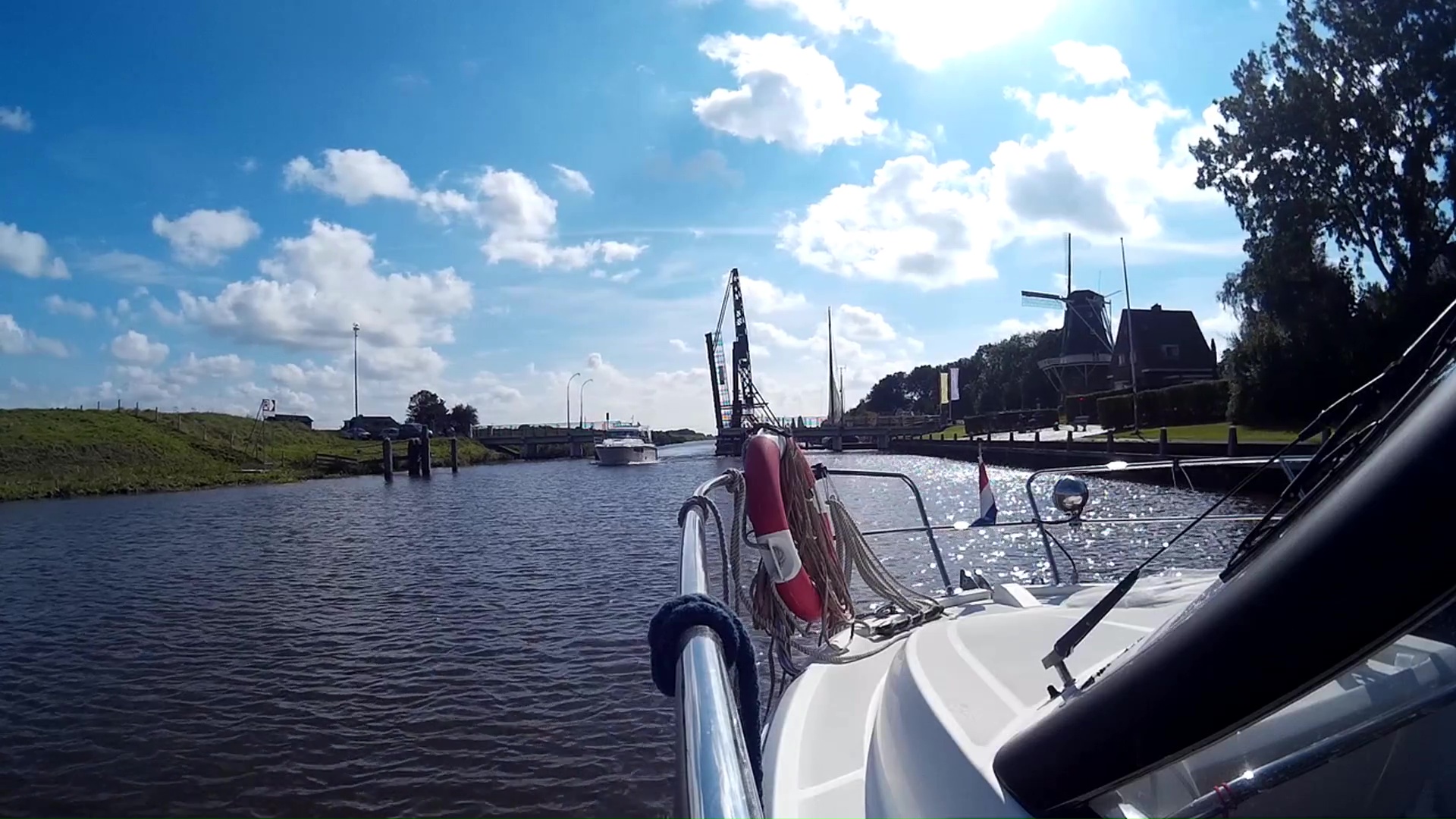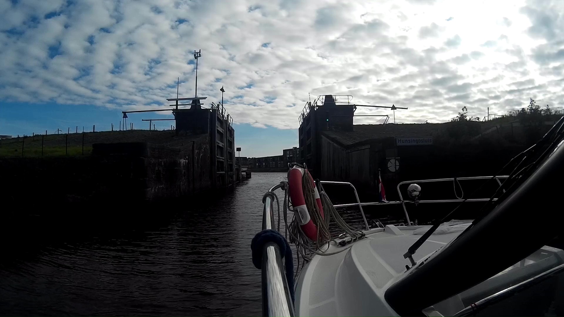 Es ist das erste mal, dass mehr als zwei Personen auf dem Boot übernachtet haben, aber es hat gut geklappt. Um 7 Uhr stehe ich auf und mache mich auf den Weg zu den Sanitäranlagen. Die sind sauber und ausreichend groß. Zurück am Boot gehen mein Sohn und seine Freundin duschen. Derweil bereite ich schon einmal das Frühstück vor, Kaffee und Müsli. Es ist 10 Uhr als wir uns auf den Weg nach Groningen machen. Von hier aus bin ich vor ein paar Jahren über das Reitdiep nach Groningen gefahren. Diesmal will ich über den Hunsingokanaal fahren und über den Kromme Rakken wieder auf das Reitdiep. Von dort soll es der Einfachheit halber über das Aduarderdiep auf den van Starkenborghkanaal gehen. Die Fahrt durch die Dorkwerdersluis weiter auf dem Reitdiep ist heute leider nicht möglich. Es ist Sonntag und alle Brücken werden bedient, außer der Eisenbahnbrücke in Groningen, schade. Also werden wir durch die Oostersluis fahren, um dann im Oosterhaven anzulegen. Ok, wir fahren erst einmal bis zur Hunsingosluis. Die ist zwar offen, aber die Brücke ist zu niedrig. So legen wir an dem Wartesteg an und mein Sohn drückt den Meldeknopf. Nach einiger Zeit wird die Brücke geöffnet, so dass wir hindurch fahren können.