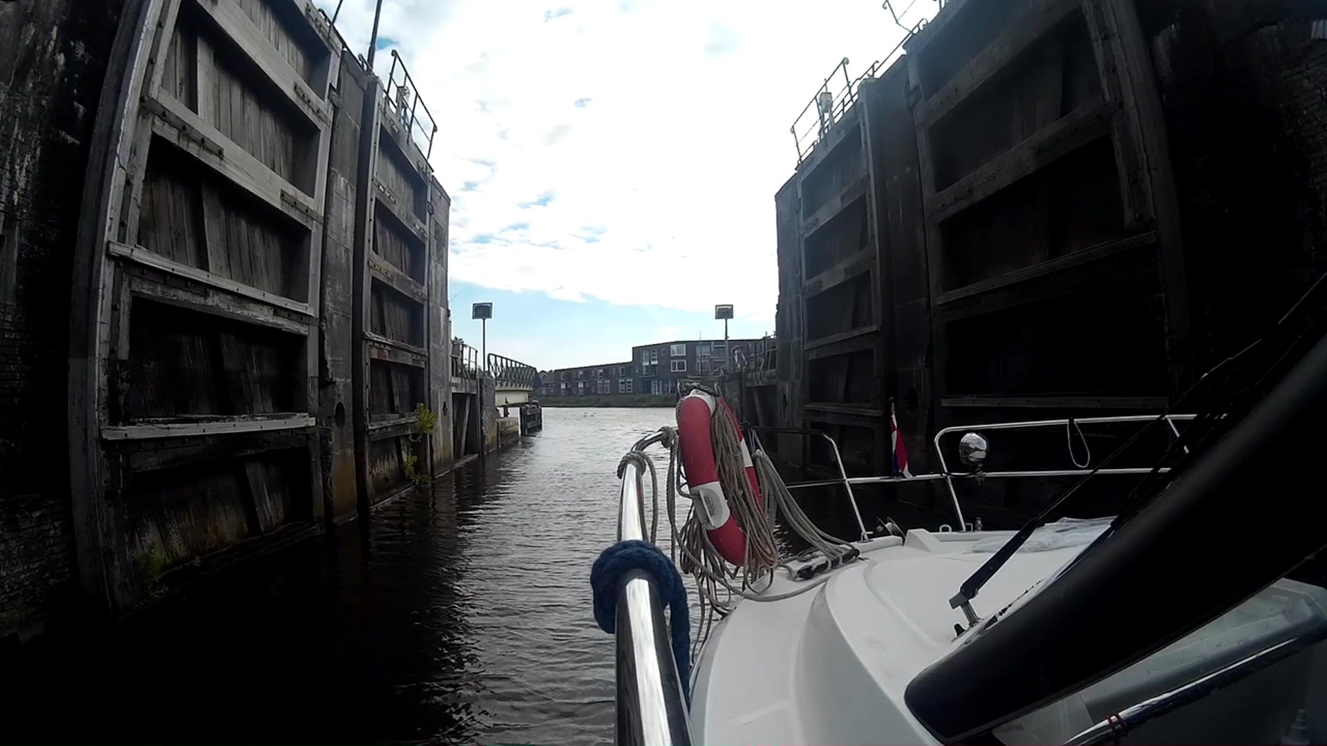 Das andere Sportboot tut es mir gleich. Als sich die Tore hinter uns schließen, spricht uns der Matrose der Schönrain an. "...wenn der vorne weg ist, dann fahrt ihr zuerst aus...". Ich bedanke mich höflich. Als die Tore vorne aufgehen und die Belladonna ausgefahren ist, fahren wir hinterher. Ein kurzes Stück und schon geht es über steuerbord auf den Eemskanaal. Nach gut 1,5 km liegt steuerbord der Oosterhaven. Ich fahre langsam am Hafen entlang, um nach einem freien Platz Ausschau zu halten. Der Hafenmeister ist anwesend und bemerkt unsere Suche. Er bedeutet uns einen bestimmten Platz anzufahren, was ich auch tue.