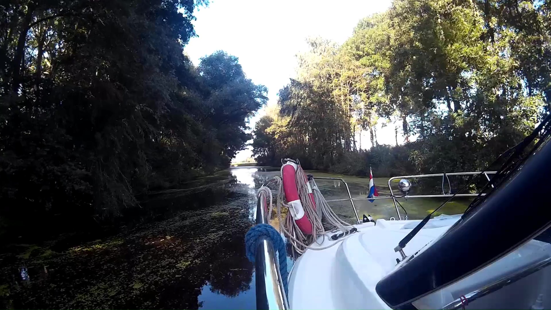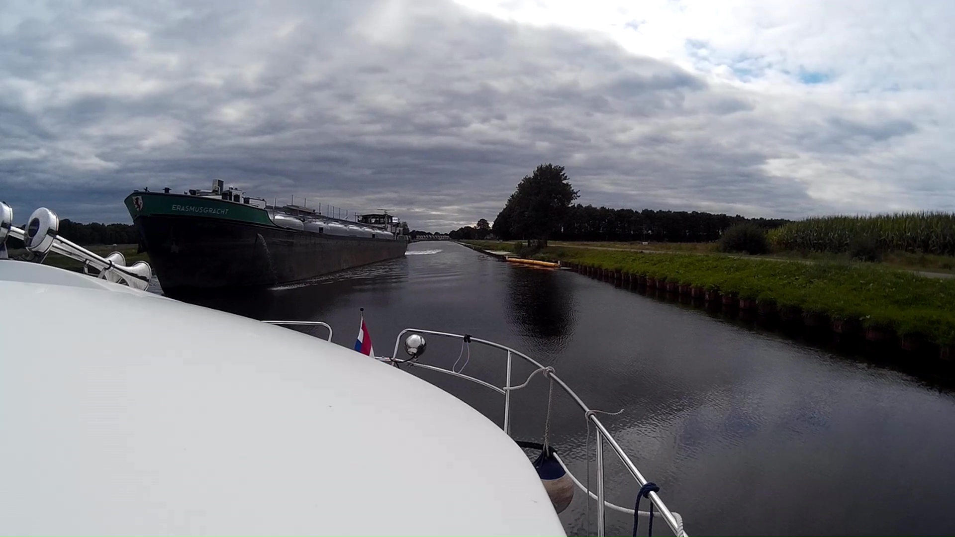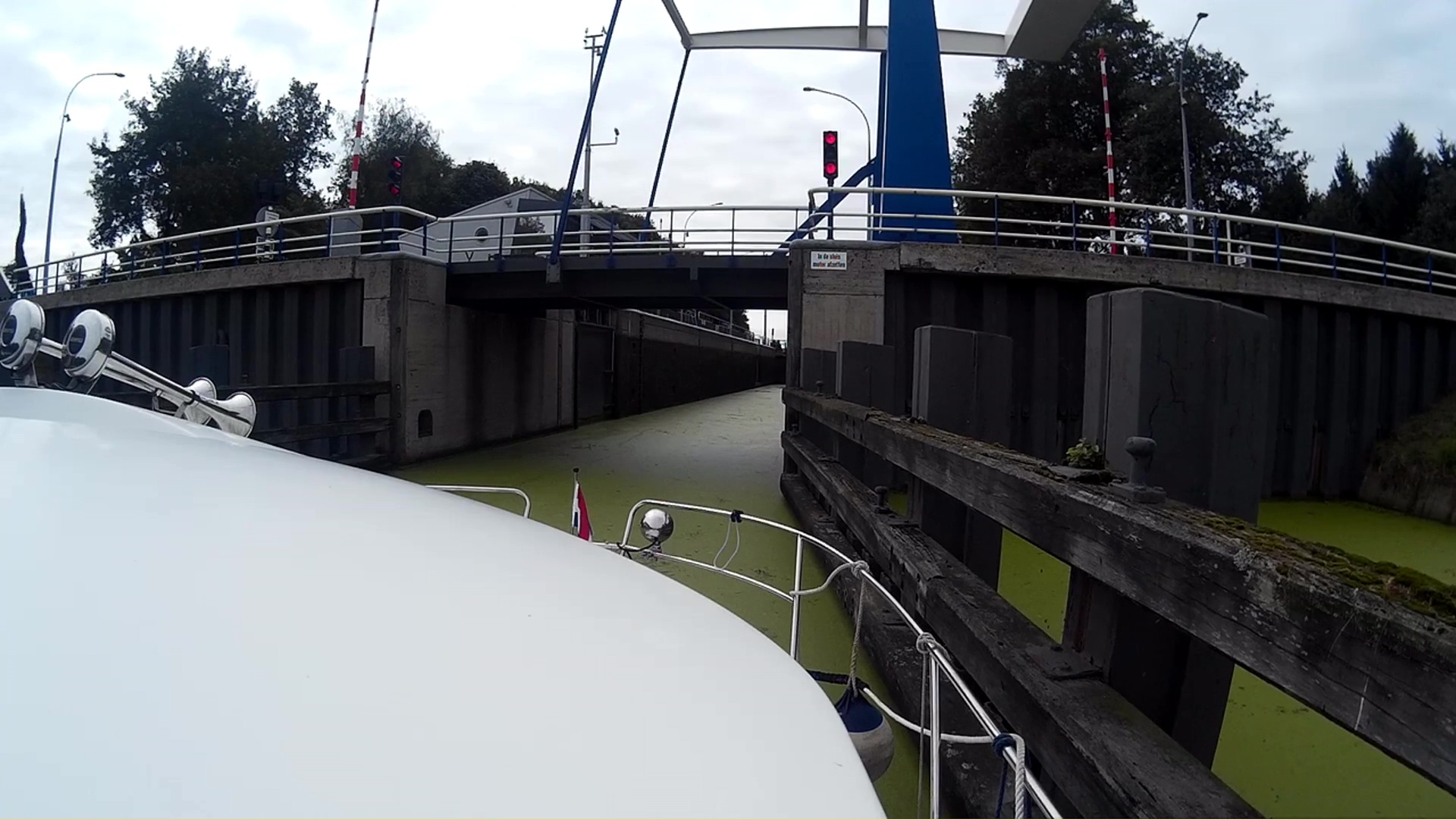 Um mich herum ist das Wasser "grün" vor lauter Wasserlinsen. Dieses Phänomen begleitet mich schon seit Beginn meiner Tour. Die Kühlung meines Außenborders hat es jedoch bisher nicht beeinträchtigt. Pünktlich zum Ende der Mittagspause gehen die Lichter auf Grün und ich kann schleusen. Wie gewohnt werden die folgenden Brücken ohne Zeitverzug geöffnet, sobald ich nah genug heran gefahren bin. Als ich die Taarlosebrug passiere, kommt mir ein Berufsschiff entgegen.