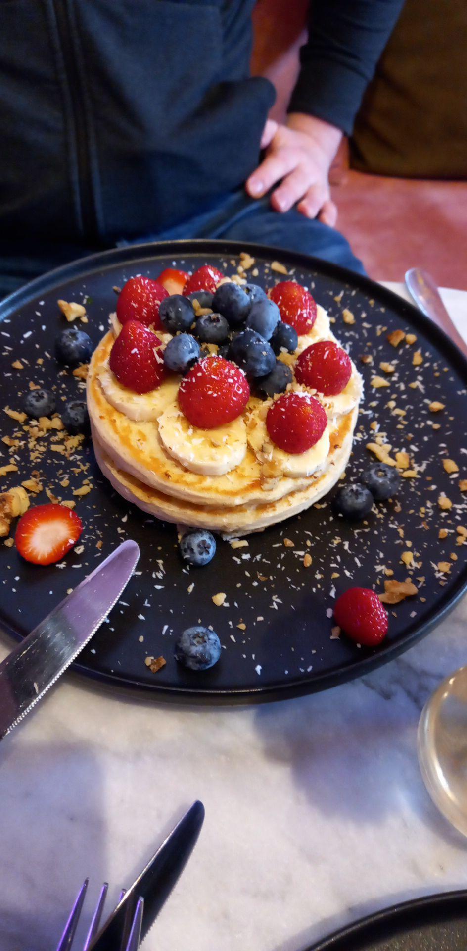 Mein Sohn ist Pancake-Fan und bevor die beiden von hier aus wieder nach Hause fahren, essen wir im Blue Bananas super leckere Pancakes.